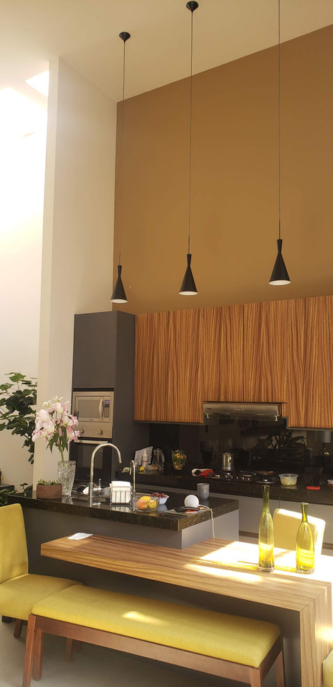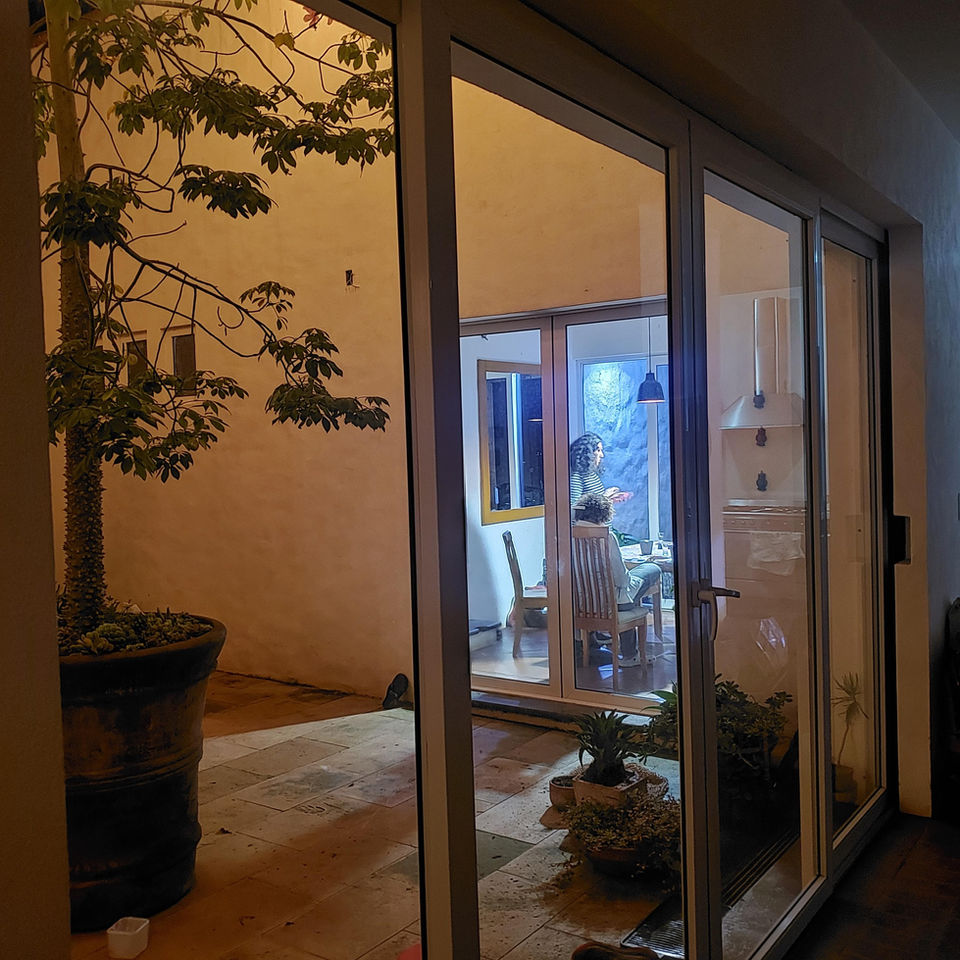 En sala, comedor y cocina se trabajó a una altura y media para dar mayor amplitud, y el espacio se integra completamente al patio mediante un cancel plegadizo, convirtiéndose en una sola área social. Se instalaron luces de cortesía que pueden encenderse desde el buró para brindar seguridad nocturna sin molestar, y se dejaron preparaciones para control de iluminación, televisión y cámaras de seguridad mediante comandos de voz con Alexa.